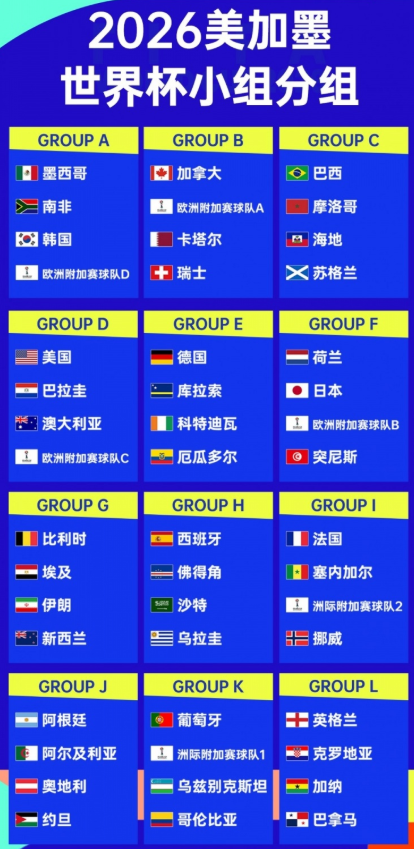 早些时候,国际足联公布了世界杯抽签规则,抽签仪式定于12月6日凌晨1点在华盛顿举行。此次抽签的核心变化是设立“夺冠热门组合”机制,确保热门球队在小组赛阶段后才可能碰面。国际足联排名前四的西班牙、阿根廷(前两名)与法国、英格兰(三、四名)便属于这一组合。若这四支球队以小组第一身份出线,在决赛前也不会与同组别夺冠热门球队交锋。